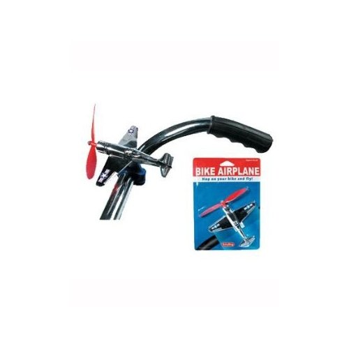 Mount this plastic airplane to your bike's handle bars and get ready to take off.As you ride, the plane's oversized propeller turns in the breeze. 4.5" x 4.25".Some assembly required. Phillips head screw driver necessary to attach to bike.Ages 6 and up.Bike Airplane
